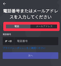 電話番号もしくは、メールアドレスを選んで入力してから、「次へ」のボタンをおす。